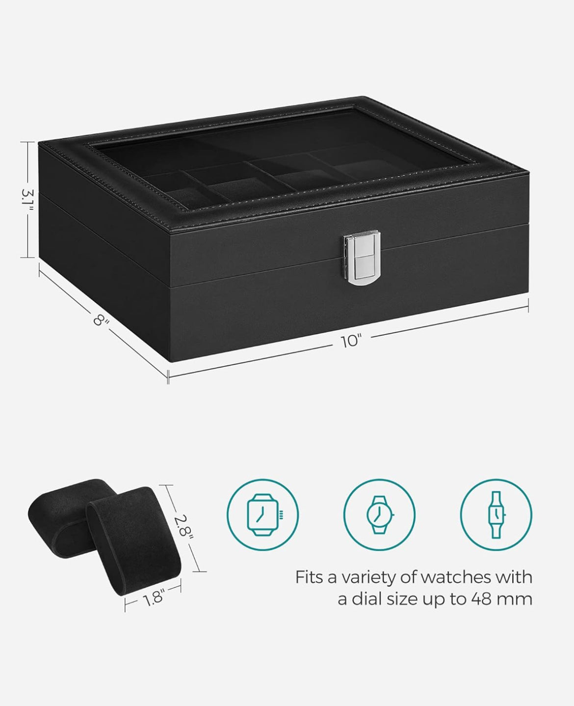 SONGMICS Watch Box 10-Slot Watch Case with Large Glass Lid - Black