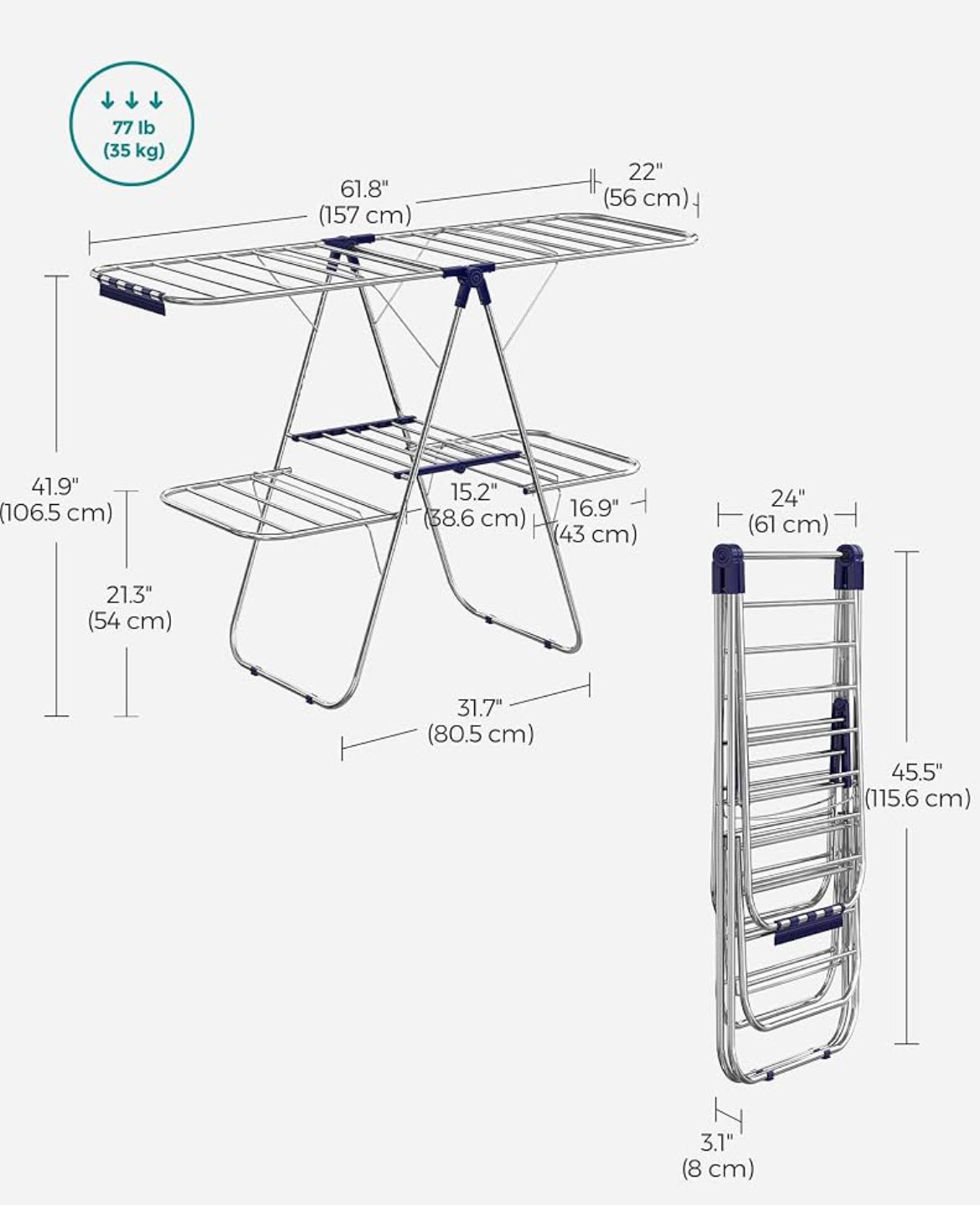 SONGMICS 2-Level Clothes Airer Foldable Clothes Drying Rack with Adjustable Wings - Silver / Blue