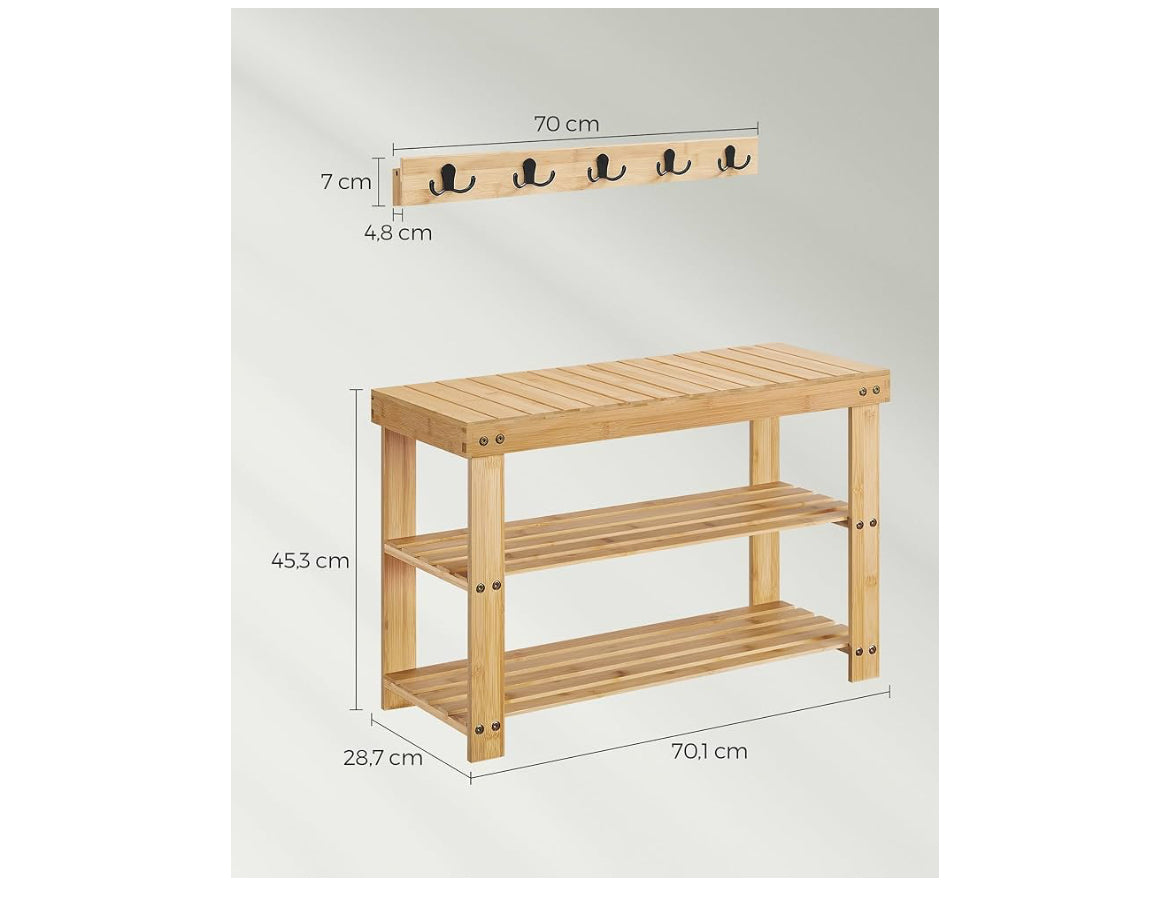 SONGMICS Shoe Bench Wall Coat Rack Set Shoe Rack with 5 Double Metal Hooks - Natural Beige