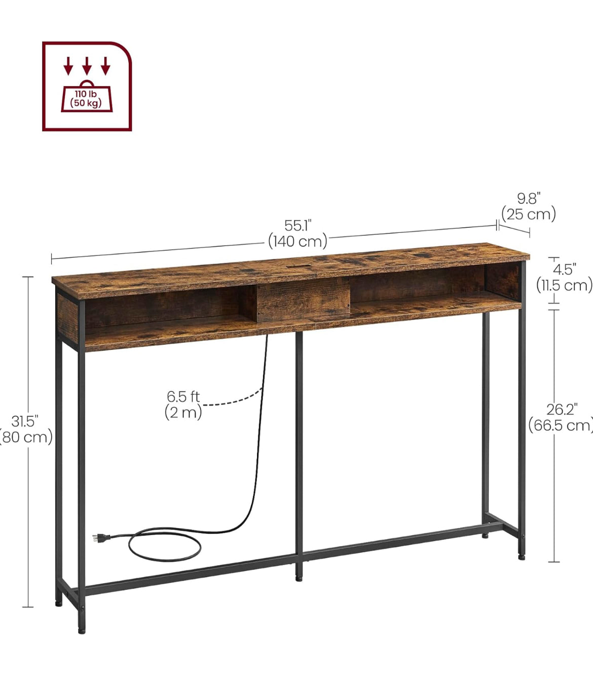 VASAGLE 55.1" Console Table with Outlet and Shelves w/ Charging Station - Brown