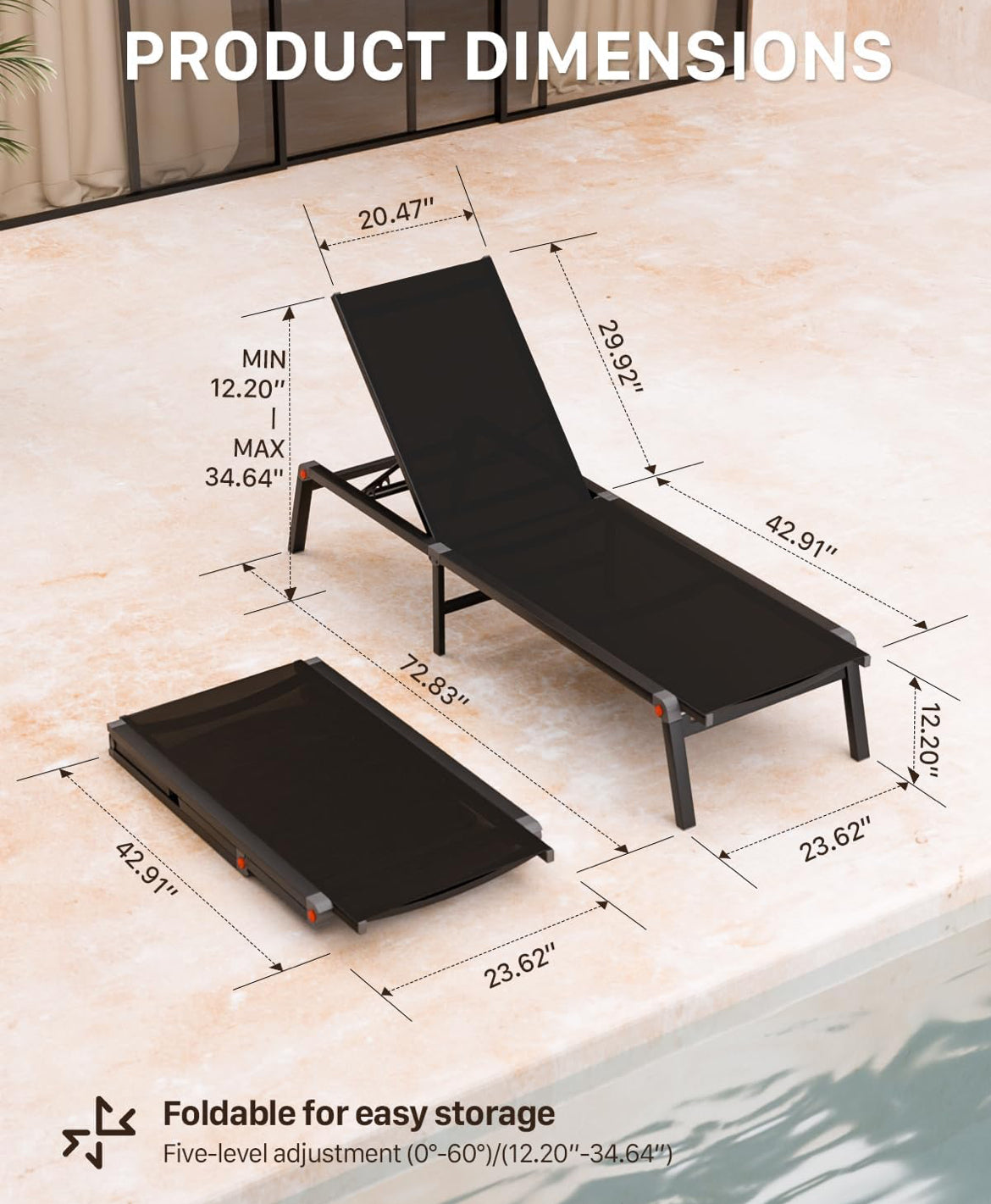 Aluminum Chaise Foldable Patio Lounge Chair Outdoor, Metal Deck Lounger Adjustable 5-Position Recliner Set of 2 - Black