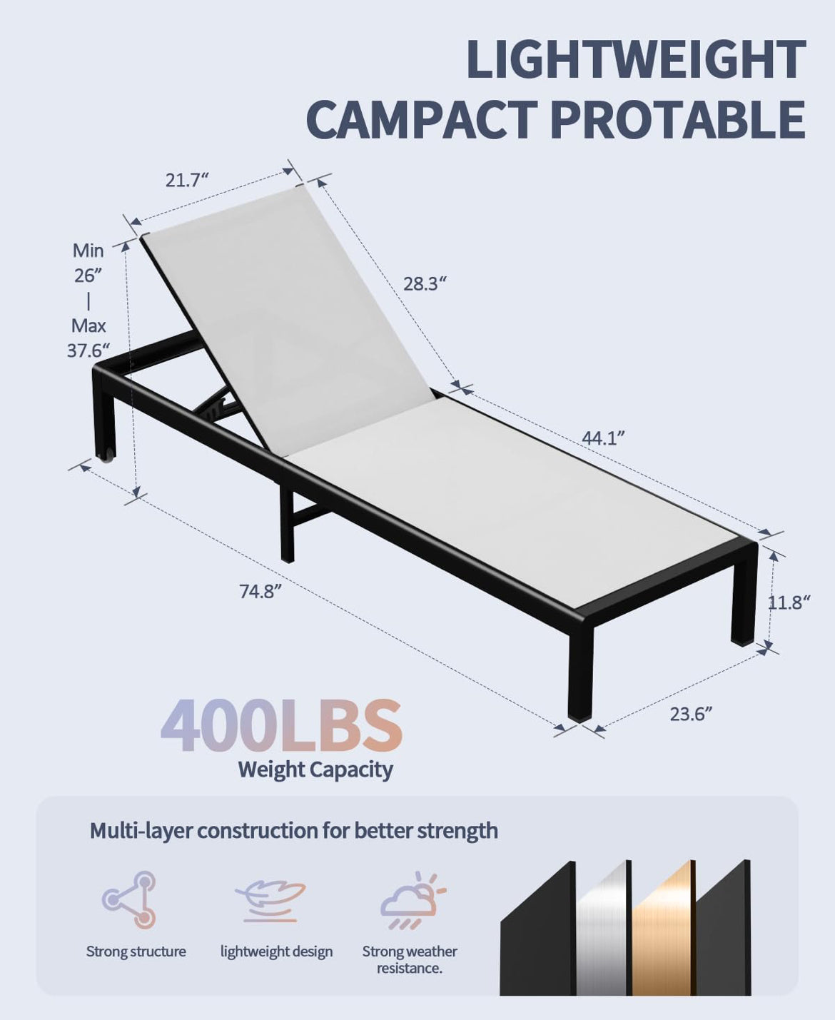 Aluminum Outdoor Chaise Lounge Chairs Patio Metal Deck Lounger 5-Position Adjustable Backrest Chase Recliner Set of 2 - Black