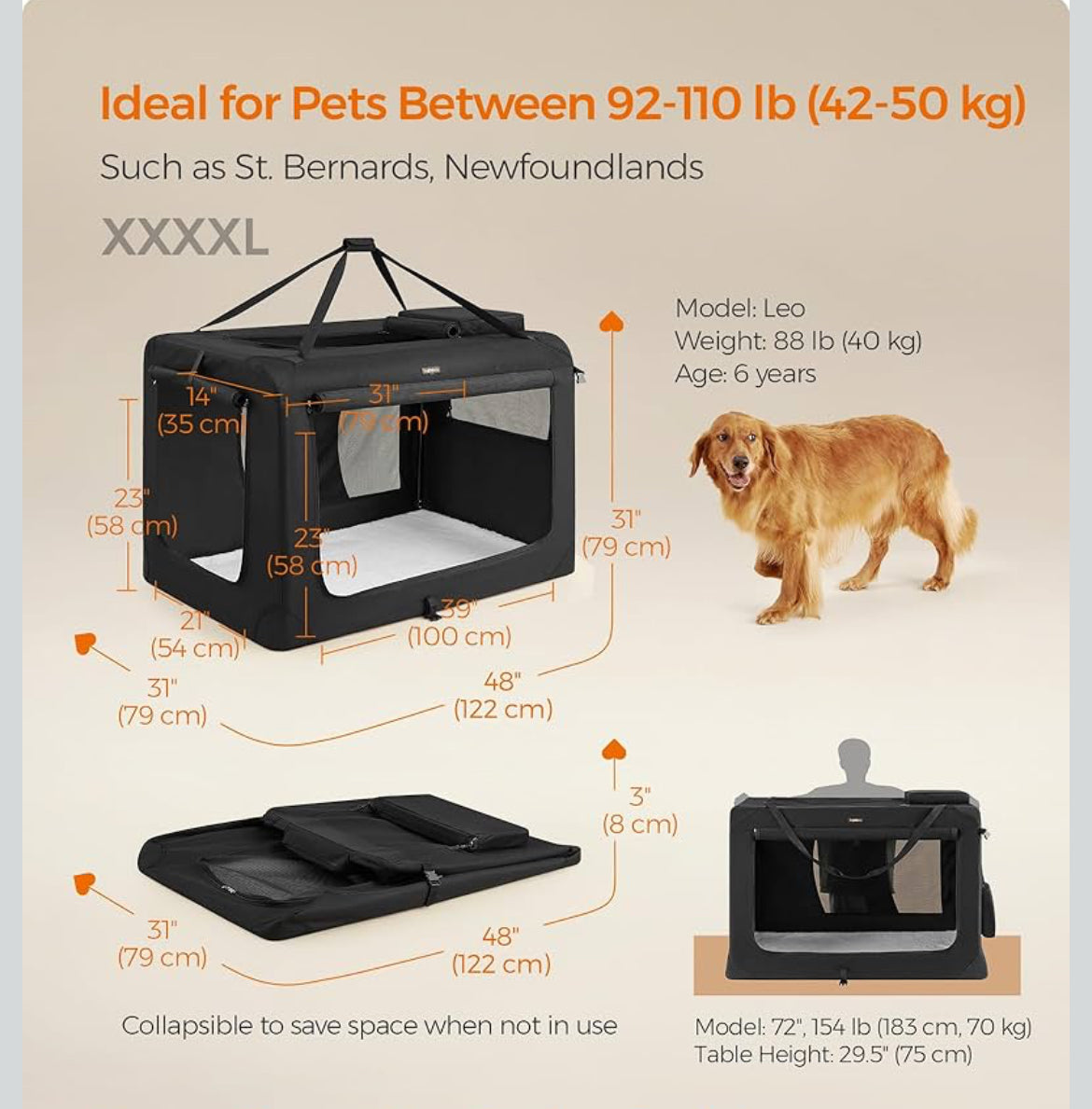 Feandrea 48" Collapsible Soft Crate Portable Travel Dog Crate - Black