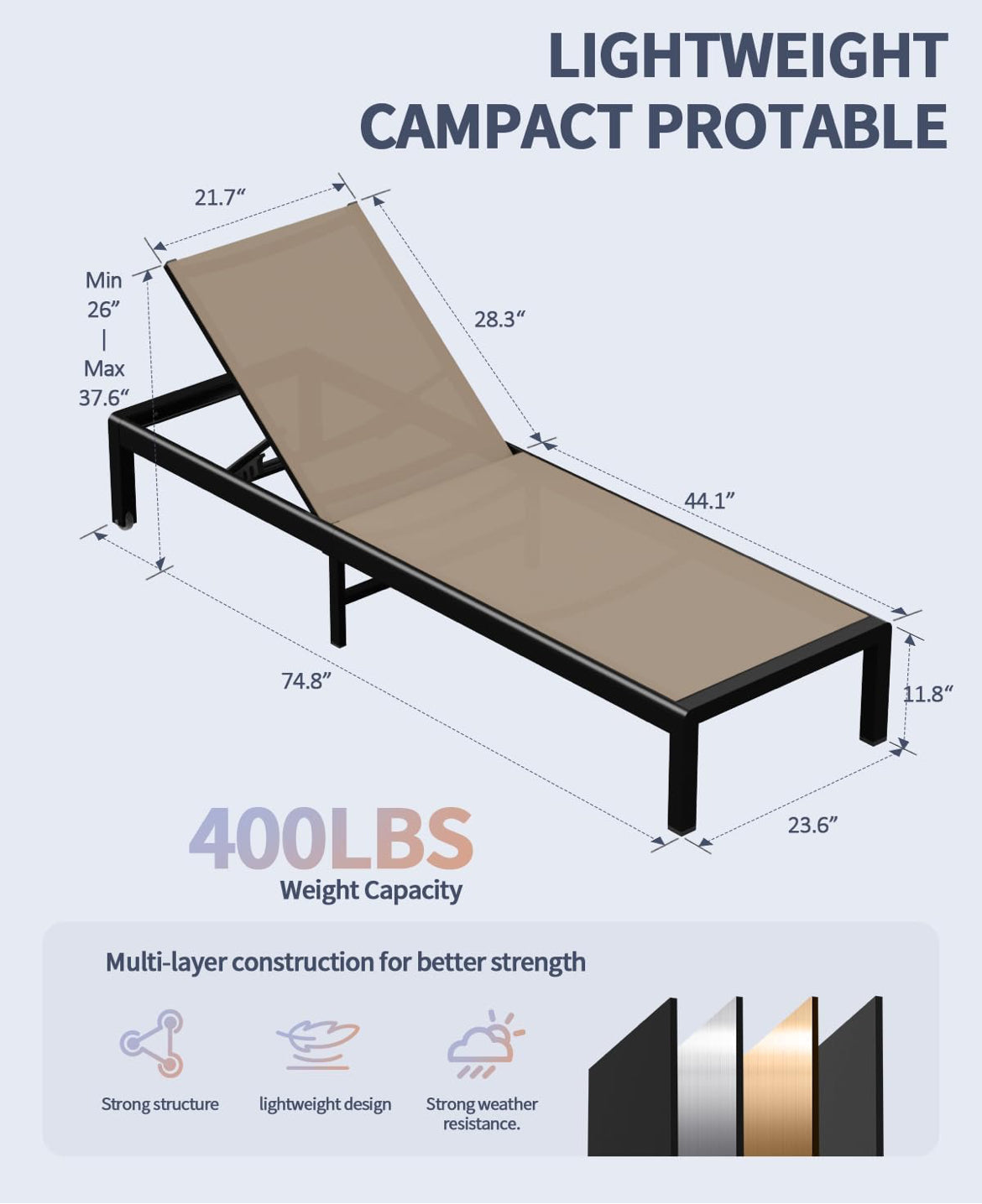Aluminum Outdoor Chaise Lounge Chairs, Patio Metal Deck Lounger 5-Position Adjustable Backrest Chase Recliner with Wheels - Khaki