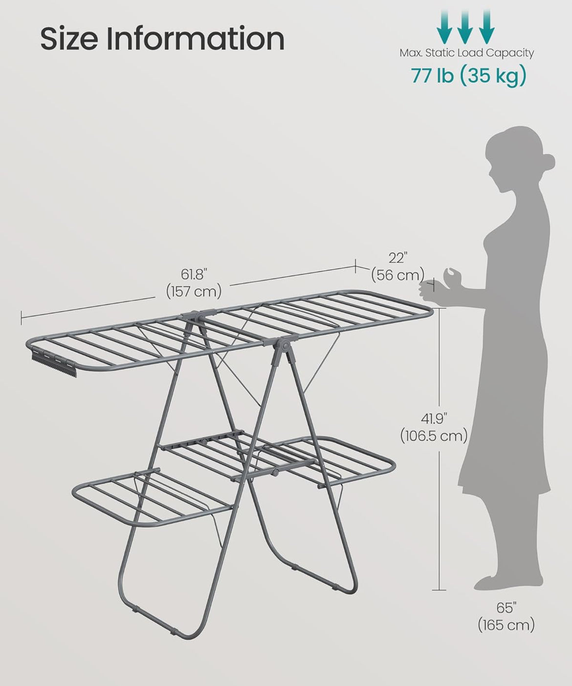 SONGMICS Clothes Drying Rack Foldable 2-Level Laundry Drying Rack - Gray
