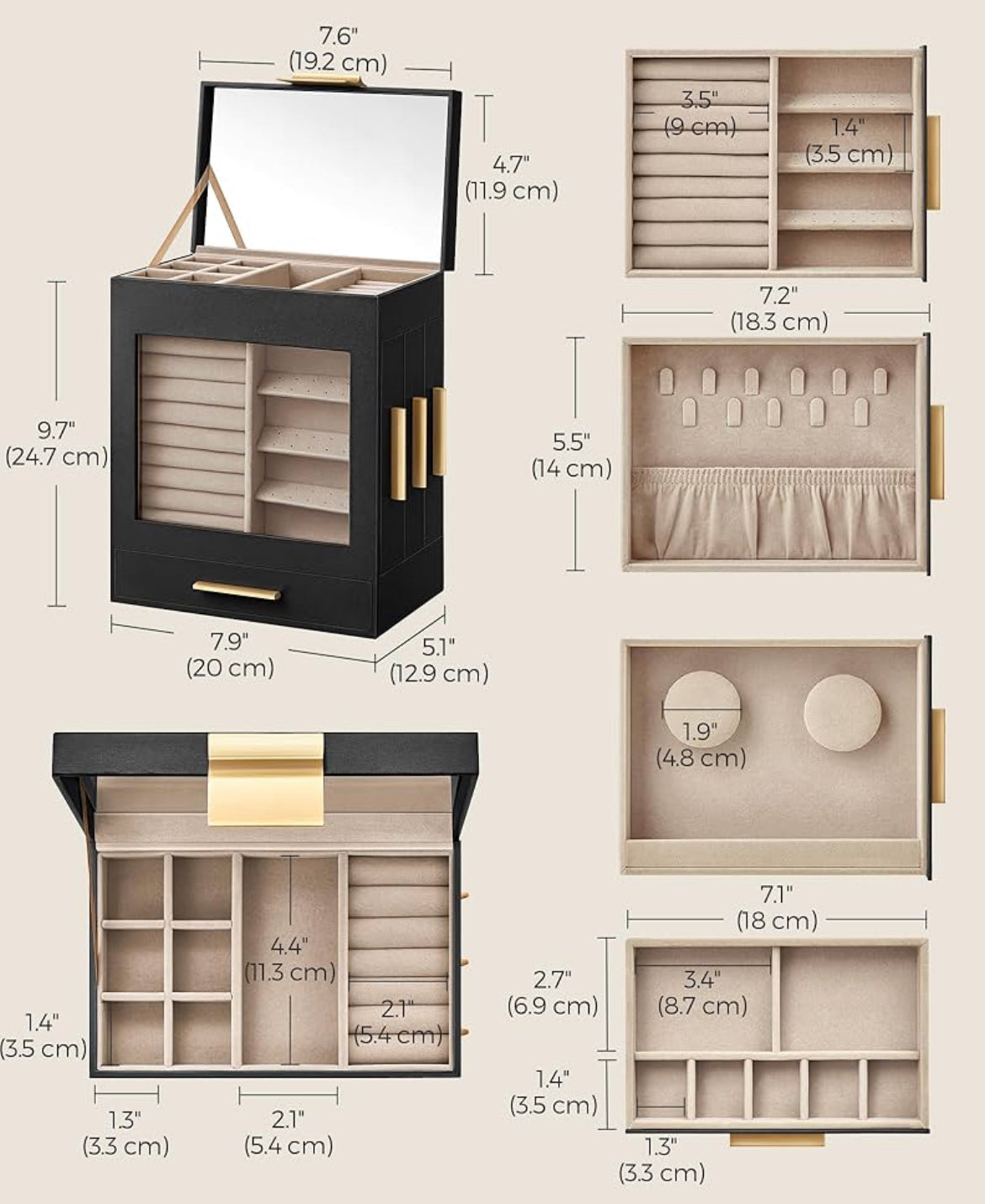 SONGMICS Jewelry Box with Glass Window 5-Layer Organizer with 3 Side Drawers - Black