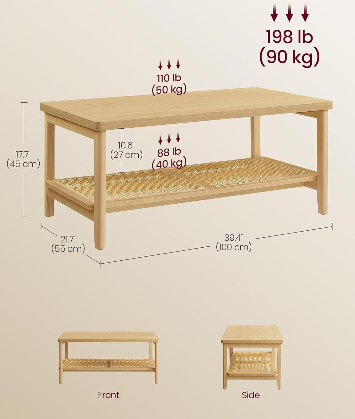 VASAGLE 2-Tier Coffee Table for Living Room Rattan Storage Shelf - Oak Beige