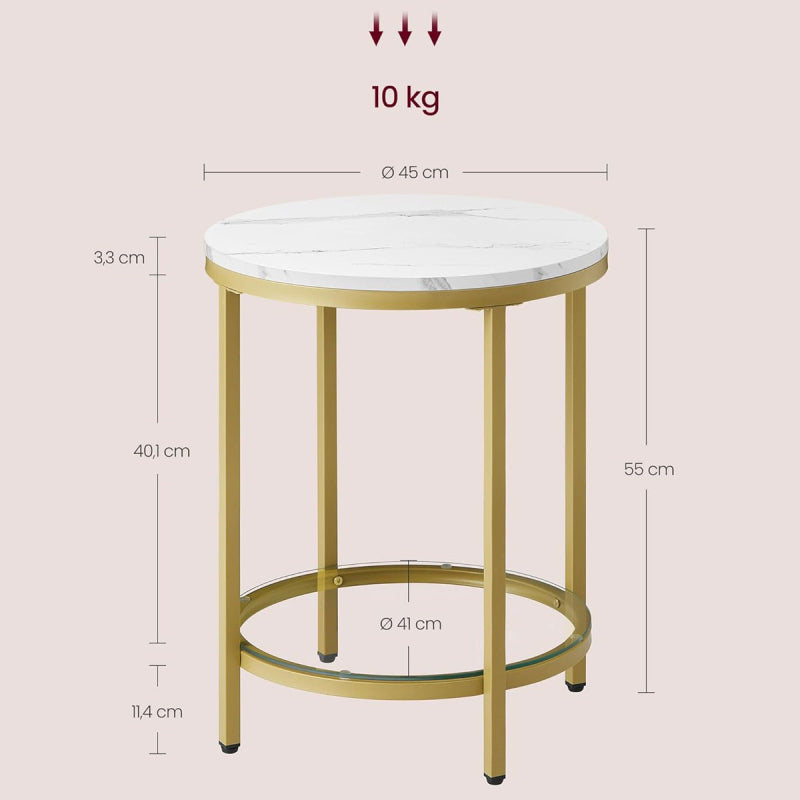 VASAGLE Small Round Side Table w/ Faux Marble Top Glass Shelf Modern Style - Gold